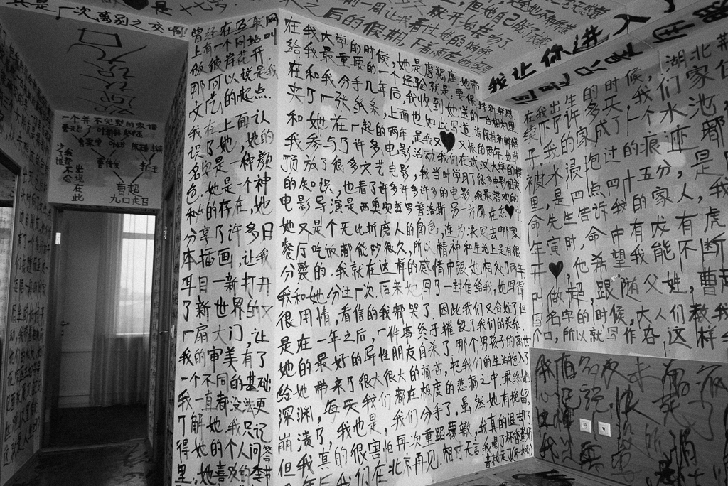*九口走召将完成一个没有图像的大作,一个类似于山洞的文字游戏,这个类似于小说的墙面涂鸦,如同九口的摄影作品,都会引导观者进入其个人、私密的世界。九口的工作试图打破自身创作上的惯性。他——一个小说家,一个叙事者。希望将一个个人的故事,转化为空间的内部,并包容观者在其中。他更强调文本、文字和撰写的动作,关于意义和认知上自然出现的障碍,也就构成了阅读者在现场遭遇的并非文本,而是图像。窗子上出现的俄文——诗,从窗子望出去的远方。——李振华
