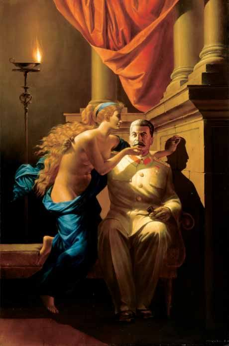 这种艺术观念的绑架事件并非对纯然的针对卡巴科夫所展开的,而是作为一种“政治正确的镜像”,将卡巴科夫反照在同时代俄国其他艺术流派中,而获得其模糊而确定的形象的。例如苏联波普艺术家组合维达里·卡马与亚力山大·梅拉米特(Komar & Melamid)在其作品使用了大量“资产阶级”符号,用反讽的方式刻意的将苏联政治人物、符号与西方流行文化与古典艺术并置,造成了一种混乱而奇特的观看体验。但戴着意识形态眼睛的评论者们仅仅看到了符号与面孔,而未曾让直接的目光在画布上多停留一阵。维达里·卡马与亚力山大·梅拉米特的作品事实上并不仅仅如安迪沃霍一般在使用符号本身,他们首先是在使用一个古典绘画的场景,借用古典的叙事方式在画面中构成一幕戏剧,然后替换掉戏剧中的英雄与资本主义者们,替换上苏联的政治人物。换言之,在画面中起效的,不仅仅是符号,更重要的是叙事。时空错位的符号,所导致的并不是对意识形态的直接攻击,而是构筑了一个苏联式的故事,让人们反讽的窃笑声中获得自身的价值。美国式的波普艺术则全然不同,其所针对的首先是图像工业的生产在60年代语境下的问题,即使是在使用政治性的话题,美式波普艺术也在强调消解图像、艺术与生活本身,而不是为其作品凭空的增加许多意义。利用图像的角度不同,所制造的意义截然相反,这并不是简单的使用图像理论加意识形态批判就可以解释的。